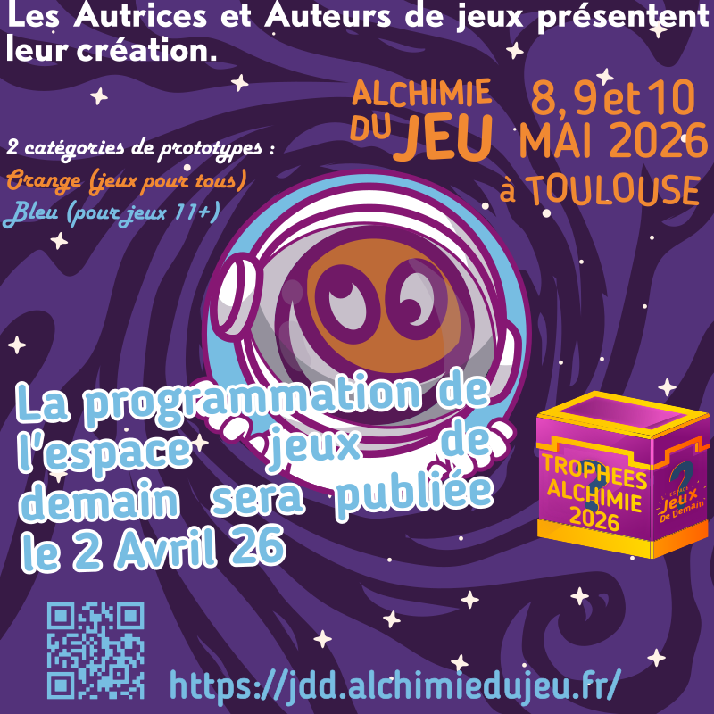 Jeux de Demain c’est l’espace du Festival Alchimie du Jeu de Toulouse qui vous permet de jouer avec les prototypes de jeux en cours de création…